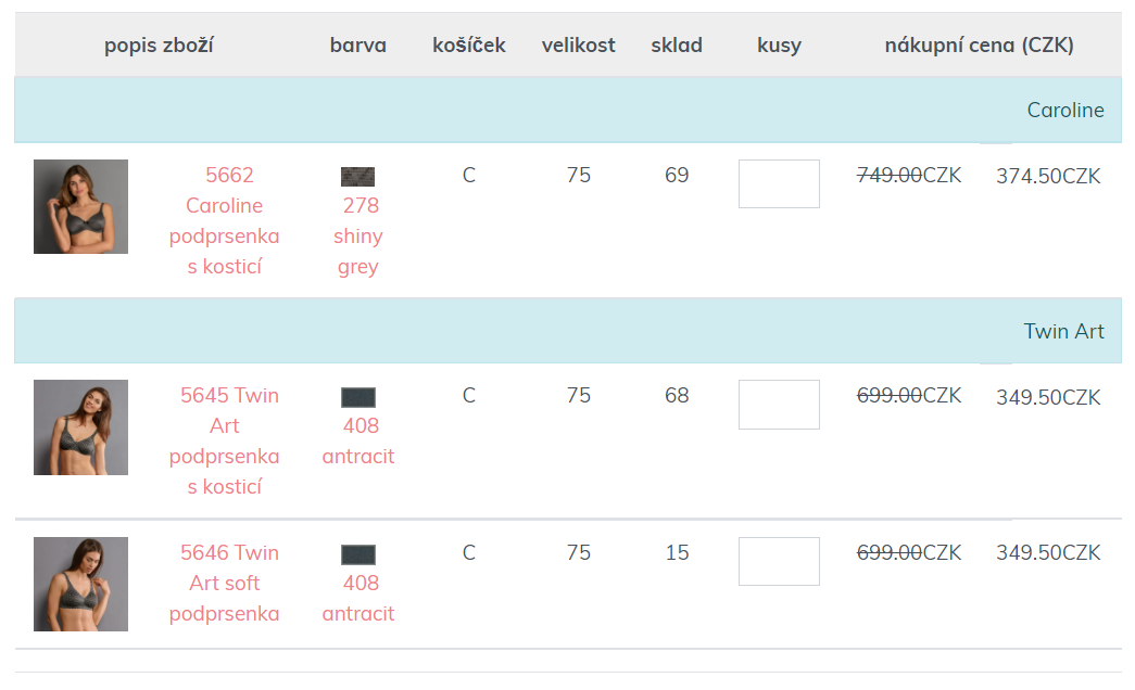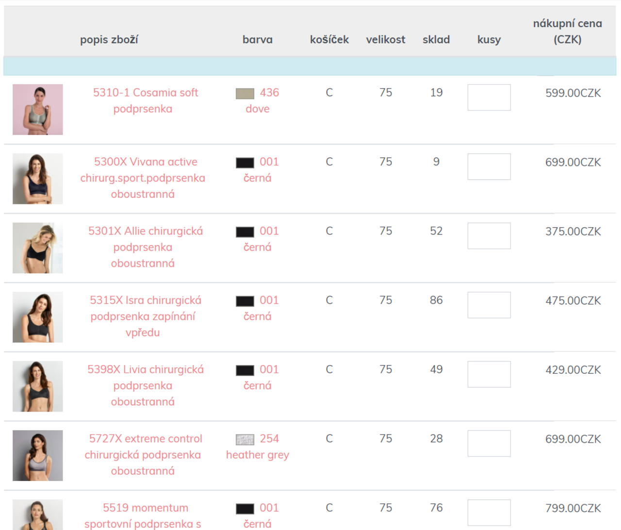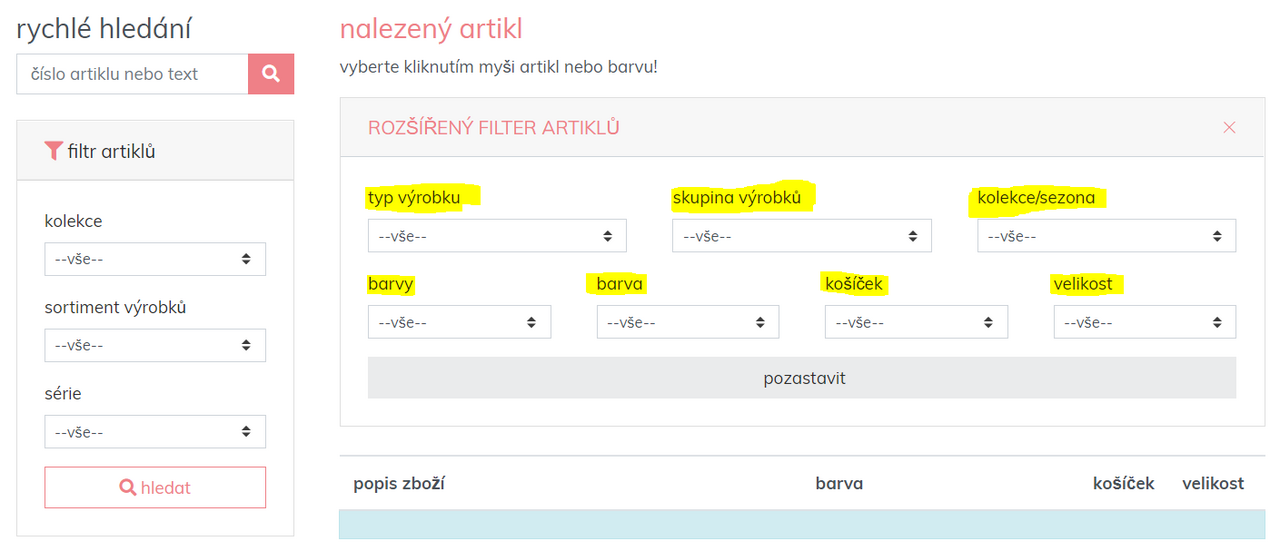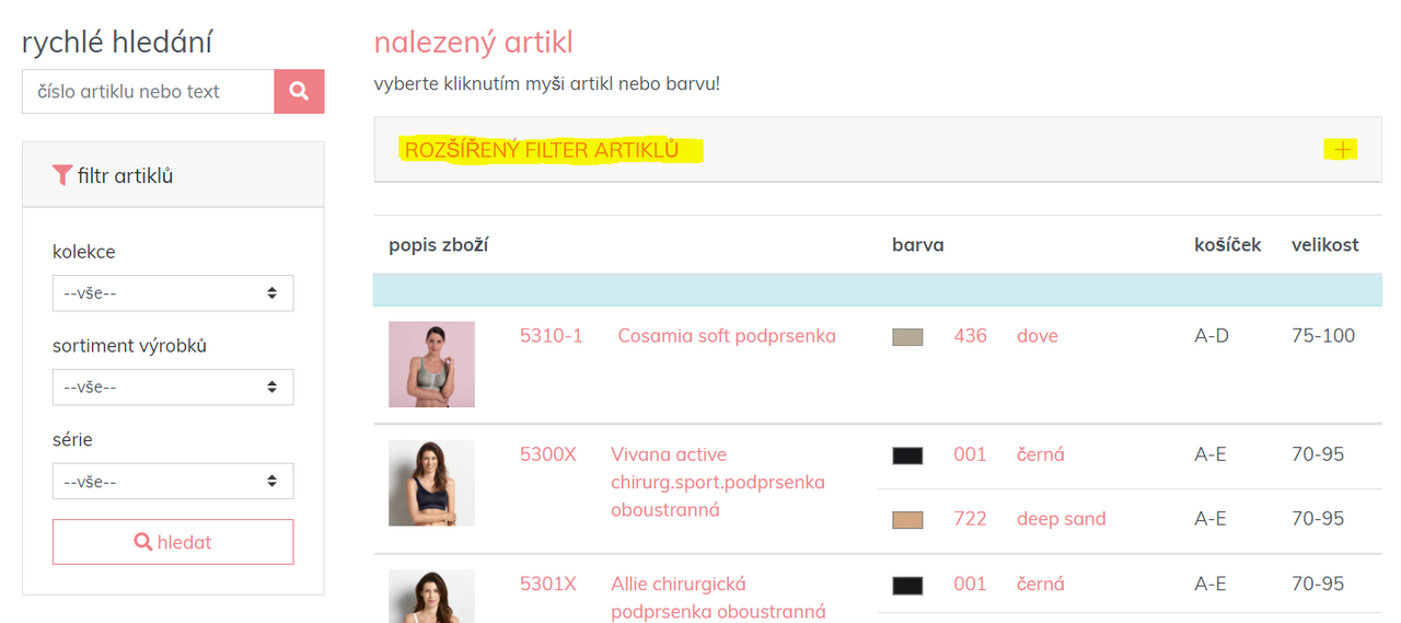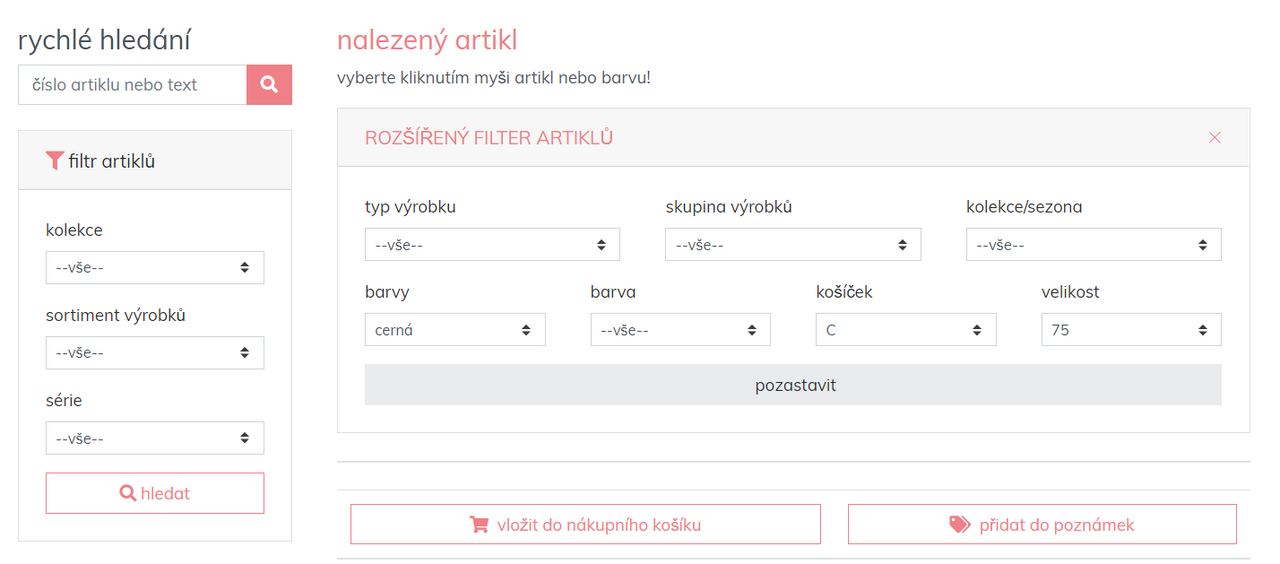 Pro rychlé vyhledání zboží v požadované velikosti, např. 75 C, a/nebo v požadované barvě, např. černé, lze použít pokročilý filtr SHOP.