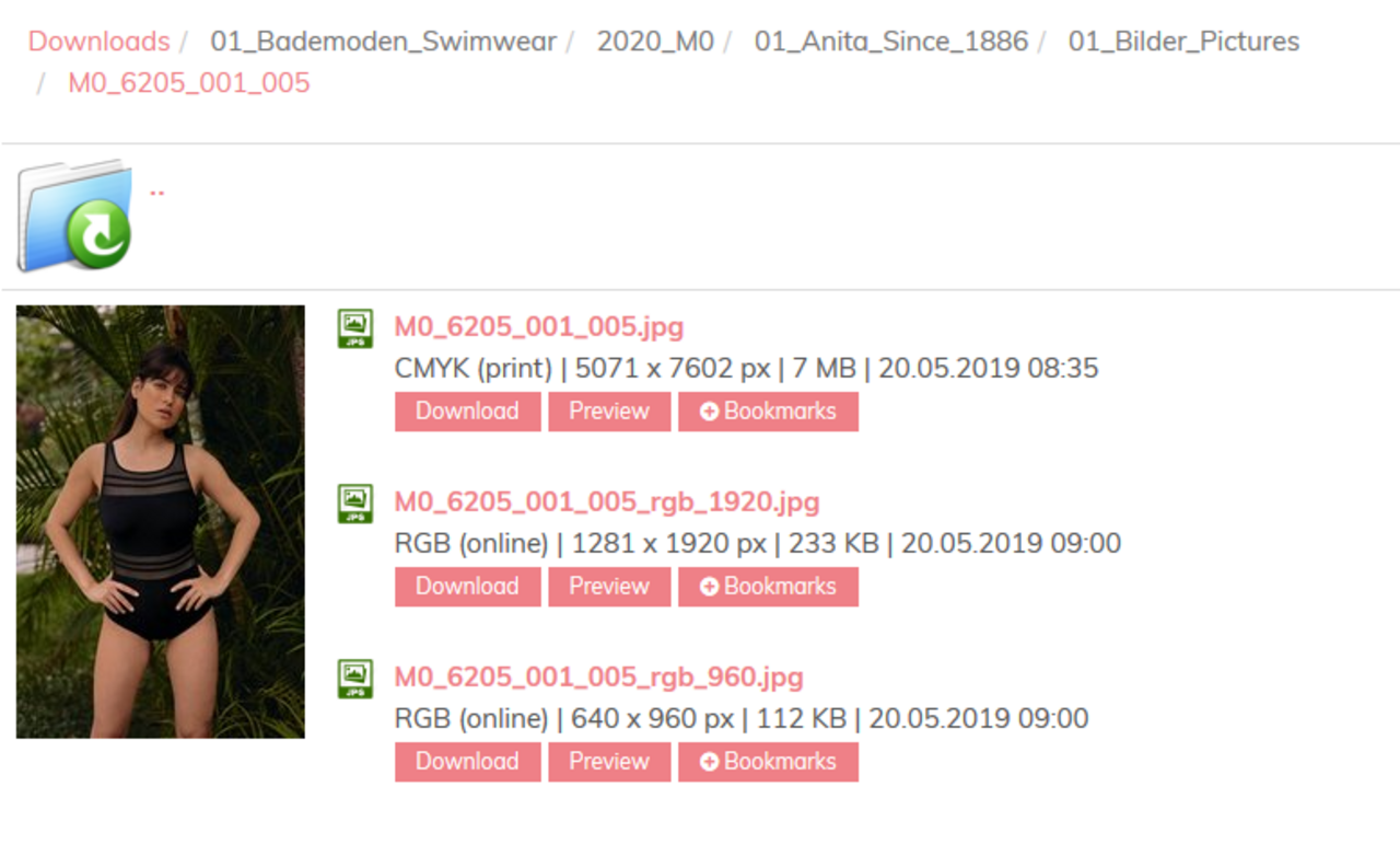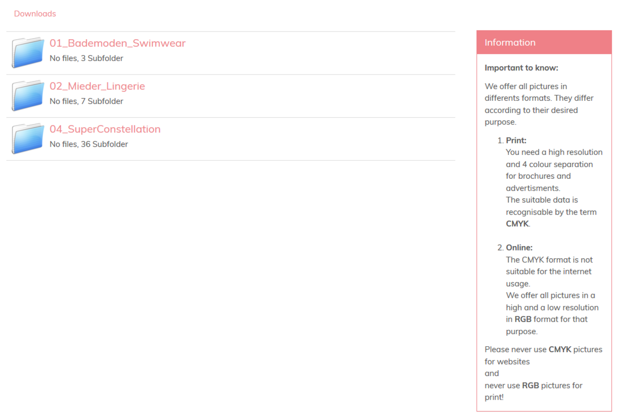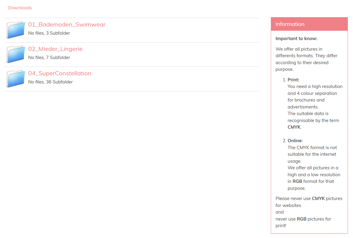 Klick for example on ‚pictures‘ and you will get to our order structure as shown underneath. In here choose between swimwear and lingerie. (Important: breast forms can befound in the lingerie section at the moment). Klick through the order structure until you get to the requested picture. On the right hand side you will find out which picture type is the right one for you. (CYMK-print, JPG-online)