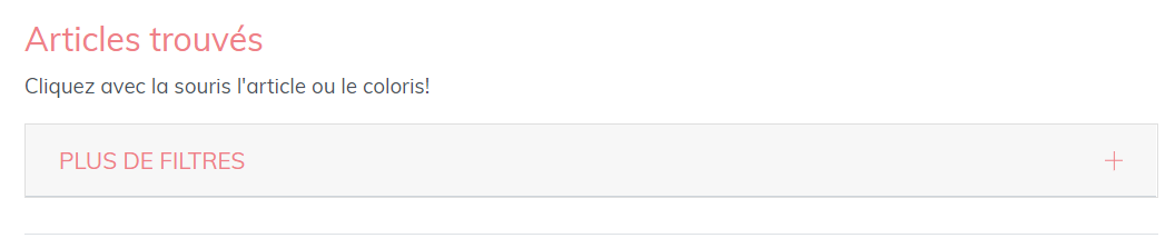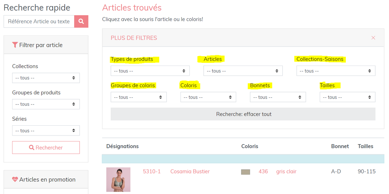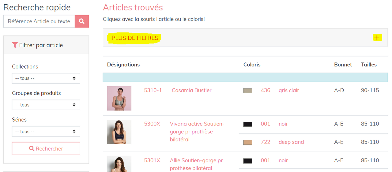 Pour une recherche rapide d'articles dans la taille souhaitée, par exemple 75 C, et/ou dans la couleur souhaitée, par exemple noir, le filtre avancé du SHOP peut être utilisé.