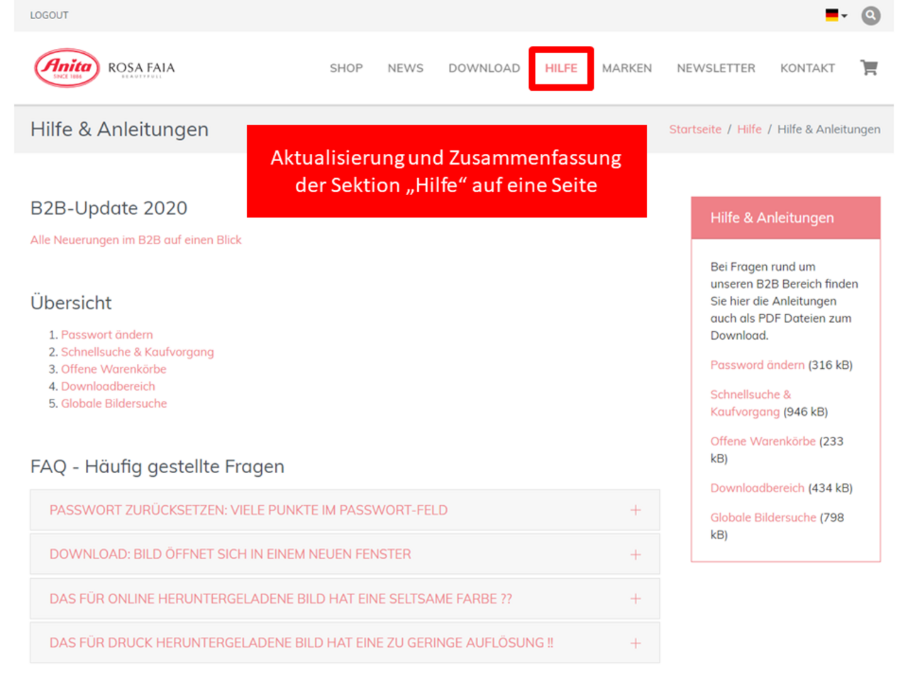 Übersichtlichere Zusammenfassung der Hilfe-Sektion auf einer Seite, die FAQs werden durch Kunden-Feedback aktualisiert: