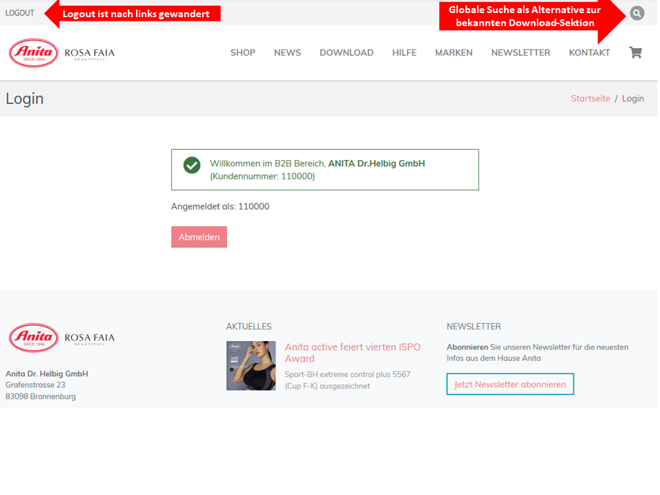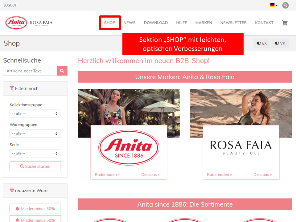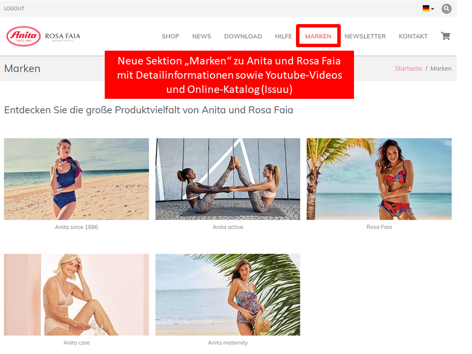 Neue Sektion "Marken" mit Detailinformationen zu Anita since 1886, Anita active, Anita care, Anita maternity, Rosa Faia und Super Constellation: