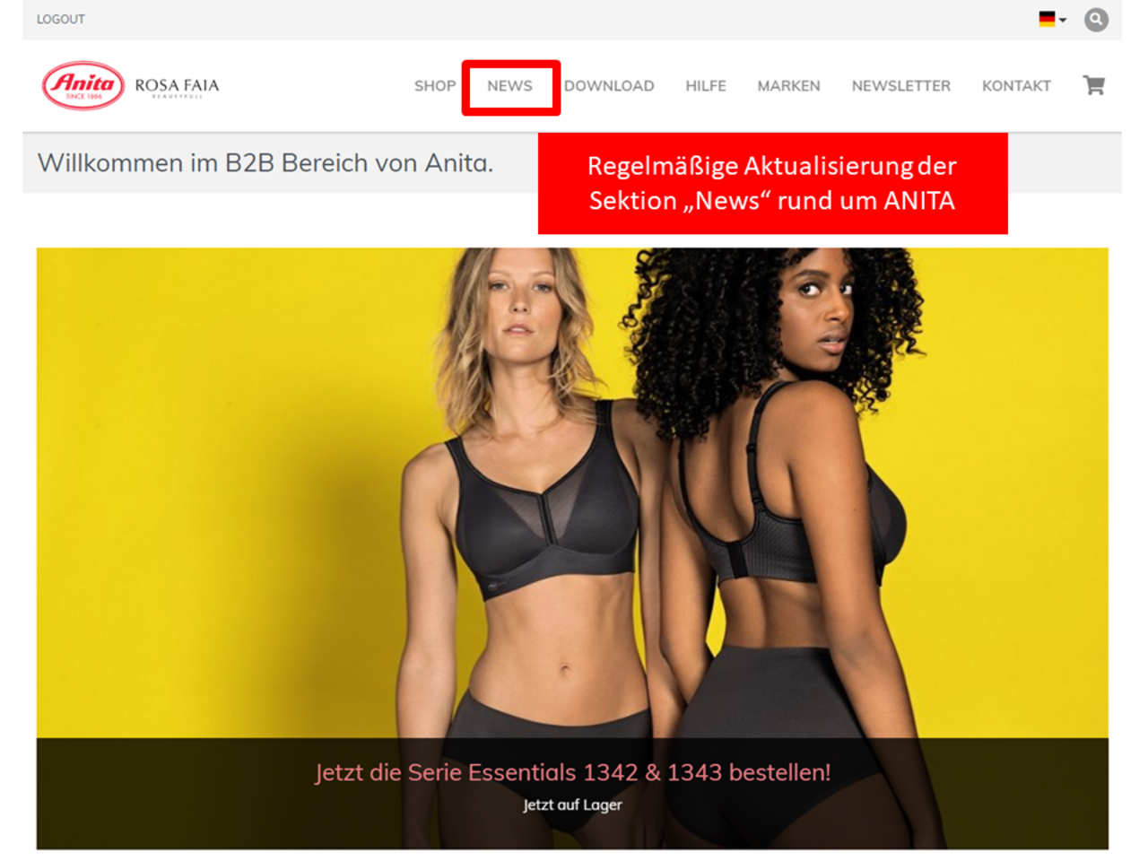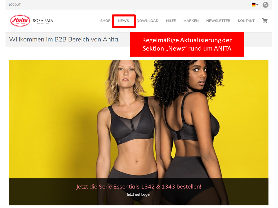 Im Bereich "News" finden sich regelmäßig Informationen zu Neuheiten auf Lager (Limited Editions, Farb-/Größenergänzungen), Aktuelles zu ANITA, Hinweise auf Awards, Link zum Anita-Blog und das KONTAKTE Magazin: