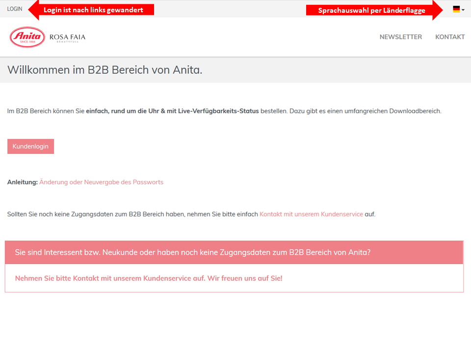 Der Login-Button ist jetzt intuitiver auffindbar links oben platziert, die Änderung der Shop-Sprache erfolgt per Länderflagge: