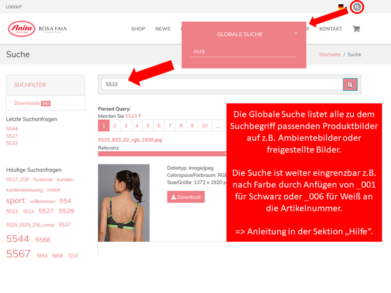 Die globale Bildersuche erleichtert das Auffinden von passenden Produktbildern (z.B. Ambientebilder oder Freisteller) anhand von Artikelnummer und Farbe: