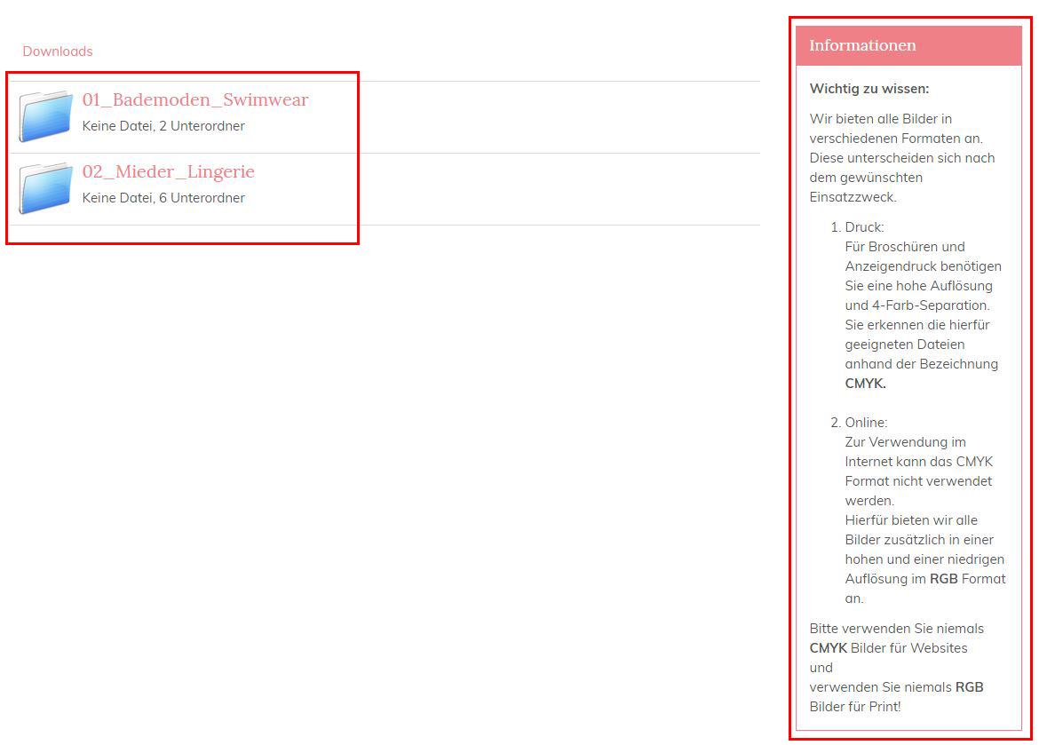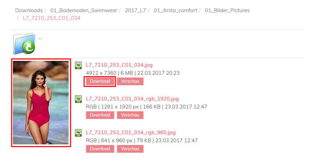 Klicken Sie z.B. auf „Bilder“ und gelangen Sie zu unserer abgebildeten Ordnerstruktur. Wählen Sie in dieser zwischen Bade und Mieder. (Wichtig! Prothesen sind im Moment auch unter Mieder zu finden) Klicken Sie sich dann durch die Ordnerstruktur zu Ihrem gewünschten Bild. Informieren Sie sich auf der rechten Seite, welcher Bild Typ für Sie der richtige ist. (CYMK – Druck, JPG – Online)