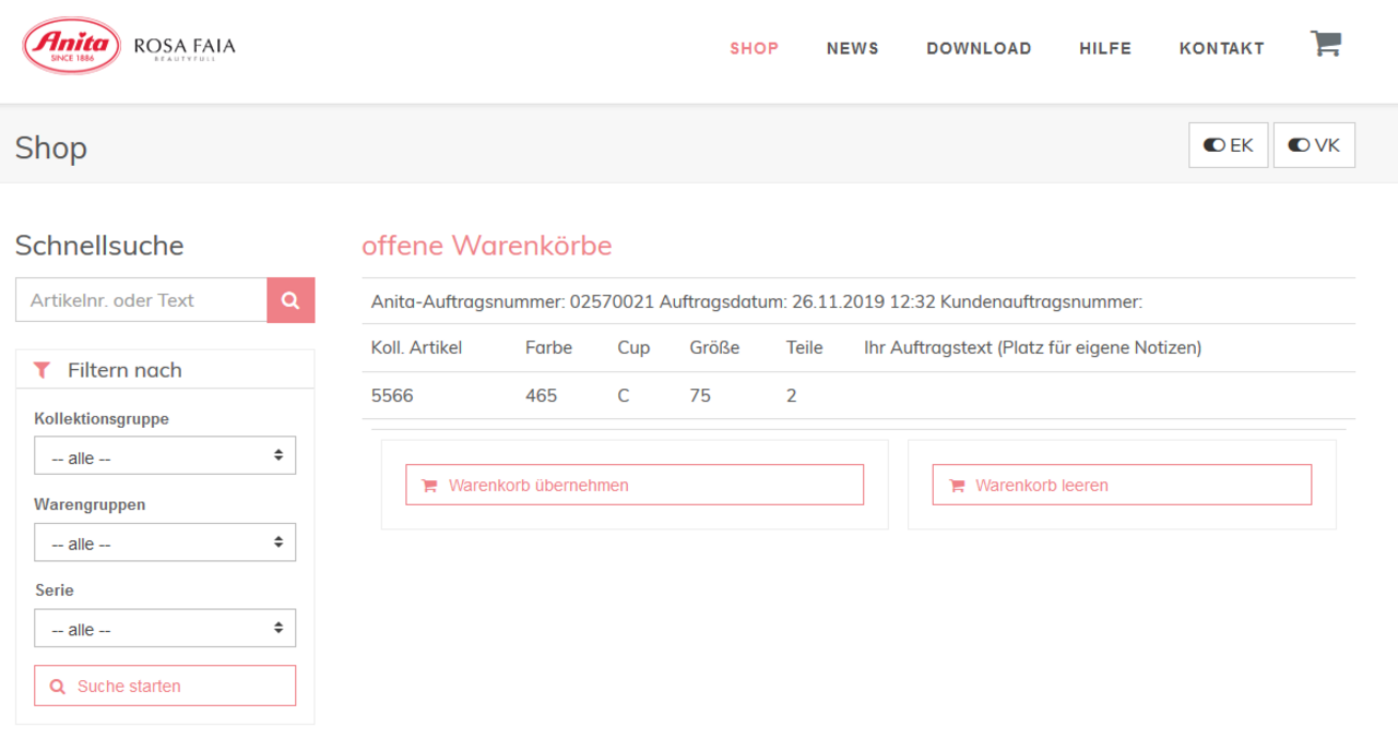 Der offene Warenkorb bleibt solange erhalten, bis Sie die Bestellung abschließen oder den Warenkorb leeren.