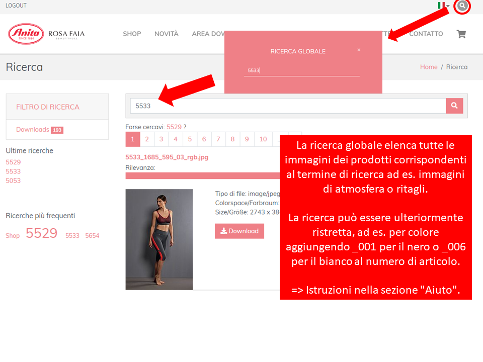 La ricerca di immagini globale semplifica la ricerca di immagini di prodotti idonei (ad es. Immagini di atmosfera o ritagli) in base al numero e al colore dell'articolo: