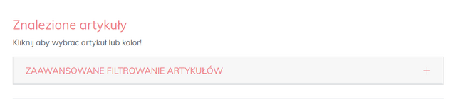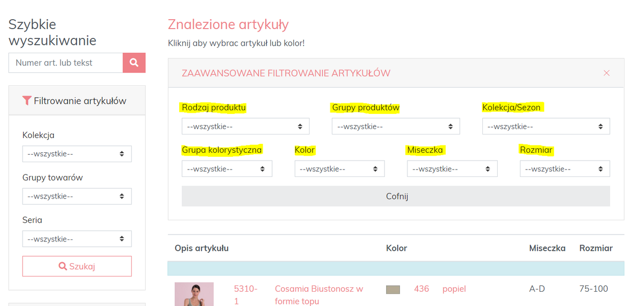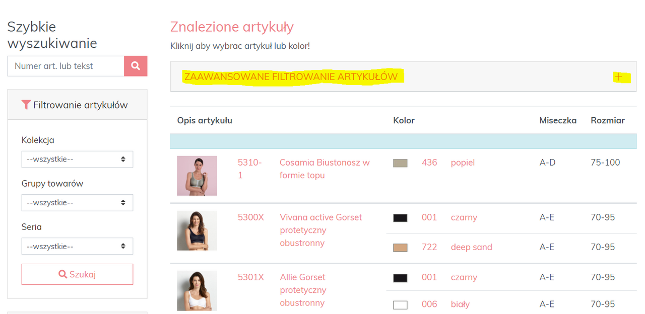 Rozszerzony filtr otwiera się poprzez kliknięcie na pasek "Rozszerzony filtr", gdzie można dokonać dalszego wyboru według typu produktu, sezonu, koloru, kubka i rozmiaru: