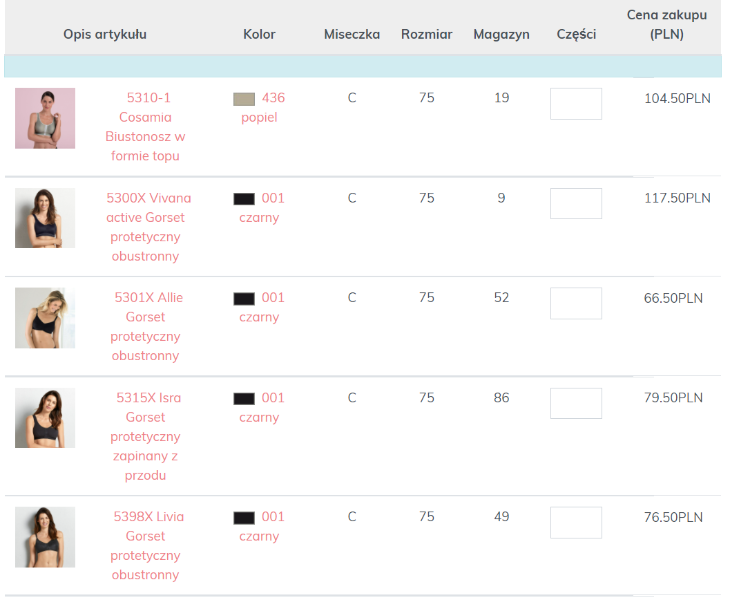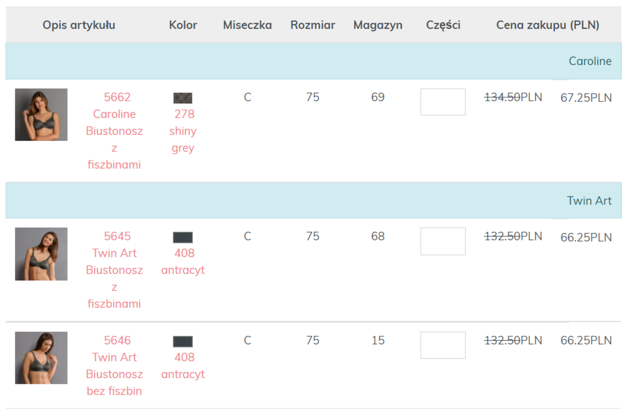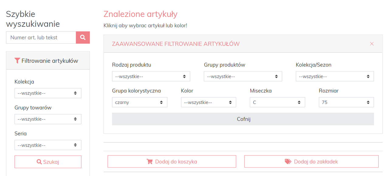 Funkcja filtrowania jest oczywiście dostępna również dla zamówień przedpremierowych oraz towarów przecenionych i ułatwia wyszukiwanie pożądanych kombinacji rozmiarów i kolorów: